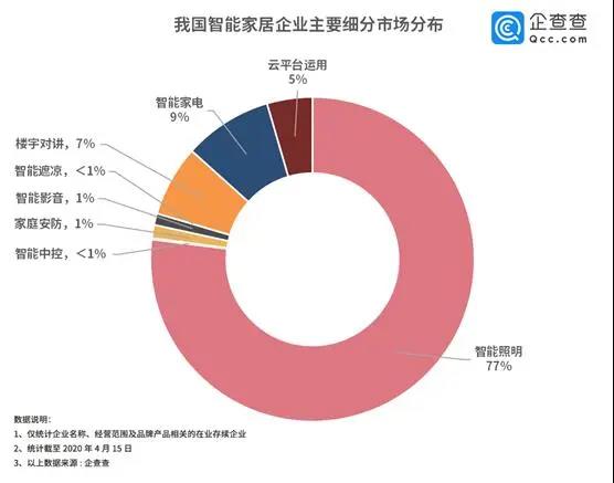家電不再是冷冰冰的擺設(shè),而是被賦予了審美和情感需求的個(gè)性化智能產(chǎn)品。智能家居作為新興行業(yè),其無(wú)接觸式的交互方式,給疫情期間的人民帶來(lái)安全、智能的生活體驗(yàn),其優(yōu)勢(shì)開(kāi)始凸顯。企查查整理了我國(guó)智能家居企業(yè)八大細(xì)分市場(chǎng),數(shù)據(jù)表明智能照明、智能家電、樓宇對(duì)講相關(guān)企業(yè)占比較高,分別為77%,9%,7%;此外,家庭安防和智能影音也頗受市場(chǎng)青睞。
